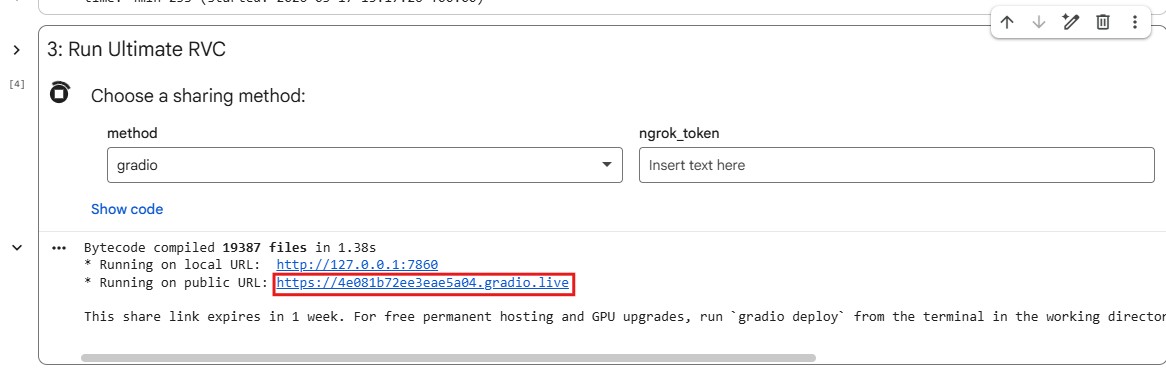 Running on public URL: https://[ตัวหนอนยาวๆ].gradio.liveให้คุณคลิกที่ลิงก์เส้นสีฟ้านี้เพื่อเข้าสู่หน้าจอทำงาน (Web UI) ของ Ultimate RVC ได้เลยครับ!