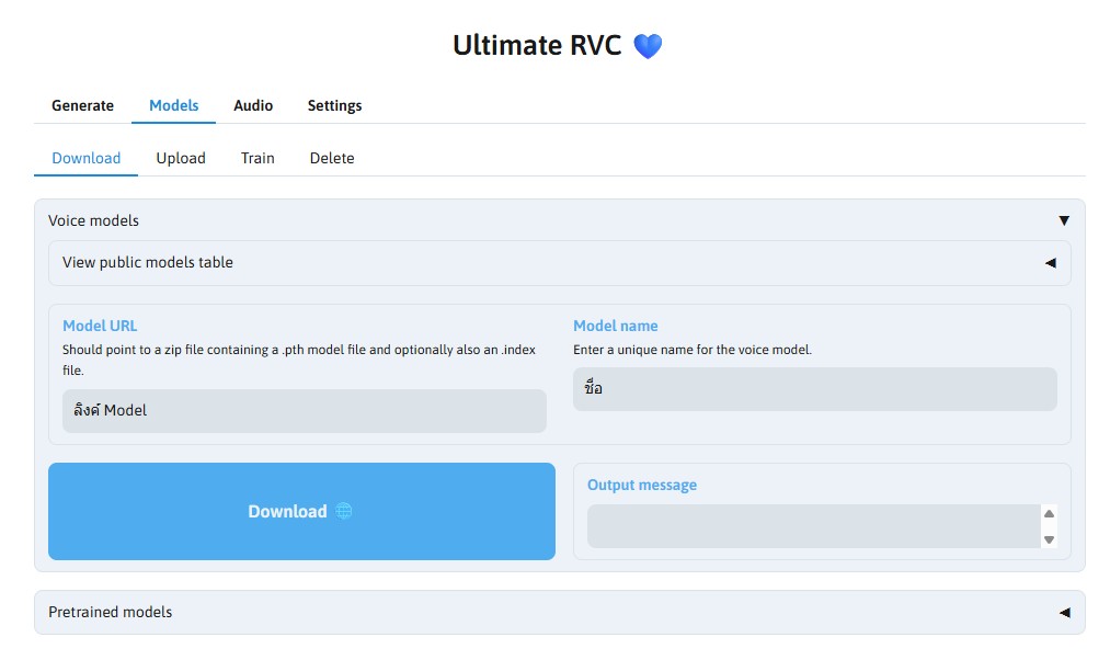 .zipของโมเดลเสียง AI ที่เราเตรียมไว้มาวางในช่องนี้ - Model name: ช่องสำหรับตั้งชื่อโมเดล ให้กรอกชื่ออะไรก็ได้เพื่อเตือนความจำตัวเอง (เช่น แบทแมน, โดราเอม่อน, ศิลปิน X)