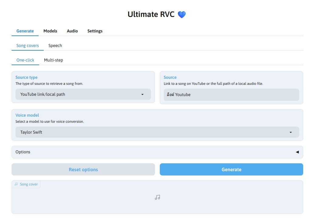 - Output name: ตั้งชื่อไฟล์ผลลัพธ์ (เช่น Song Title (AI Cover)) ถ้าไม่ตั้งระบบจะคัดลอกชื่อต้นฉบับมาดัดแปลงให้